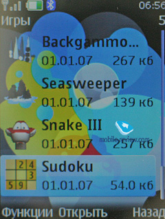 В телефоне предустановленно несколько игр, это Snake III, Backgammon II, Sea Sweeper, Sudoku.