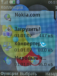 В разделе Приложения можно найти такие стандартные функции, как мировое время, конвертер величин, конвертер размеров одежды, установщик Widsets, а также каталог от Nokia для загрузки новых приложений. Также есть утилита Nokia Search, она позволяет искать как информацию, так и изображения в сети, для каждой страны используется своя поисковая машина, регион можно сменить в настройках.