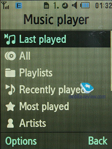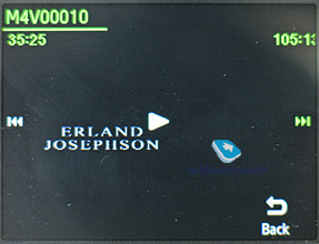 Во время проигрывания показывается номер текущей песни, общее число композиций. Эквалайзер не настраиваемый, всего 9 вариантов эквалайзеров. Появилась опция Fade Out – звук в конце композиции затухает. Проигрывание может идти как через стереогарнитуру, так и через громкую связь. Громкость имеет 14 градаций. Пользователь может создавать свои плей-листы. Плеер работает и в фоновом режиме. В этом случае на экране отображается название композиции и подсказка к управляющим элементам, что приятно.