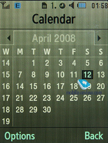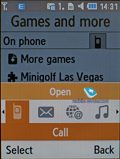 Главное меню представлено матрицей иконок (3х4). Все подменю имеют горизонтальные списки, если присутствует меню второго уровня, то справа от выбранного пункта появляется всплывающий список. Вы видите, какие подпункты содержатся в меню, по нажатию ОК переходите к ним в обычной манере. Если же отклонить навигационную клавишу влево или вправо, то можно попасть в соответствующий пункт сразу. Эргономика такого решения очевидна, экономится как минимум одно нажатие. Возможно также и отключить такой режим отображения, тогда телефон становится похож на модели других производителей, разницы в представлении меню не будет.