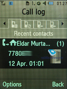 В каждом из списков указывается до 30 номеров телефонов. Есть объединенный список последних звонков (всего 90 записей), здесь иконка отмечает тип звонка. Отклоняя навигационную клавишу по горизонтали, можно быстро переходить из одного списка в другой. Для отдельной записи при подробном просмотре можно видеть дату и время звонка, а также его продолжительность. Одинаковые звонки суммируются, напротив номера показывается их число. В подробном просмотре отображается время для каждого такого звонка. Традиционно в этом меню можно увидеть общее время всех звонков и их стоимость (если услуга настроена).