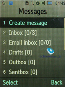 В памяти телефона может храниться до 500 сообщений, аппарат поддерживает стандарт EMS, совместим с Nokia Smart Messaging. Реализация Т9 не вызывает нареканий. При отправке можно выбрать имена как из телефонной книги, так и из списка последних использованных либо из групп. Традиционно присутствует возможность ведения черного списка для всех видов сообщений, тогда любые сообщения с указанных номеров будут автоматически удаляться. Есть возможность переносить сообщения в свои папки. Для электронной почты блокировка возможна не только по адресу, но и по теме сообщения.