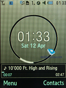 В телефоне есть встроенный mp3-плеер, он поддерживает случайное, последовательное и циклическое воспроизведение треков. Загрузить mp3-файлы в телефон можно как напрямую через Bluetooth, так и из программы синхронизации или Windows Media Player. Файлы могут иметь любые имена и теги, в том числе и на русском языке, телефон хорошо их понимает. Битрейт файлов также не играет большой роли, аппарат прекрасно понимает все доступные форматы. Также поддерживаются файлы WMA, AAC, eAAC, eAAC+.