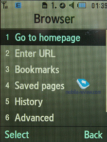В телефоне установлен wap-браузер версии 2.0 (NetFront 3.4), помимо поддержки JavaScript, масштабирования шрифтов (три типа текста), Smart-Fit (отображение сайтов в одну колонку), полноэкранного отображения картинки (все управляющие элементы спрятаны), кэширования страниц появился прообраз мышки, виртуальный курсор. Аналогично продуктам на S60 от Nokia, а также Opera Mini, есть представление страницы с мини-окном навигации. Браузер по своим возможностям крайне приятен и вполне подойдет большинству пользователей.