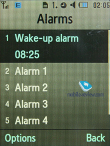 В телефоне всего пять будильников, каждый можно выставить на определенные дни недели. Для всех есть выбор из 5 мелодий, но можно использовать и mp3. В настройках можно указать, будет ли телефон включаться автоматически при наступлении события или нет.