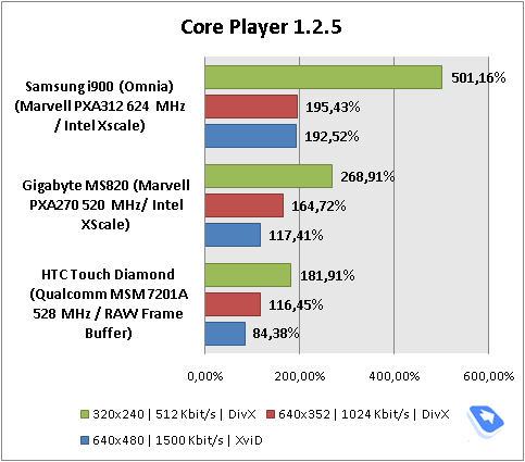 Мы провели тестирование Gigabyte MS820 с помощью бенчмарка, встроенного в видеоплеер Core Player. Напомним, что результат, равный 100%, говорит о том, что видео в указанном разрешении и качестве будет проигрываться на устройстве без заметных «притормаживаний», выпадение кадров возможно лишь в динамичных сценах. Значение выше 120-130% означает, что мощности аппарата хватит для безупречного (без зависаний и выпадения кадров) проигрывания видео указанного разрешения и качества.