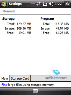 Коммуникатор обладает 128 Мб оперативной памяти, из которых для работы приложений доступна большая часть, около 75 Мб. Даже при активной оболочке Smart Touch от Gigabyte под запуск приложений остается более 60 Мб оперативной памяти.