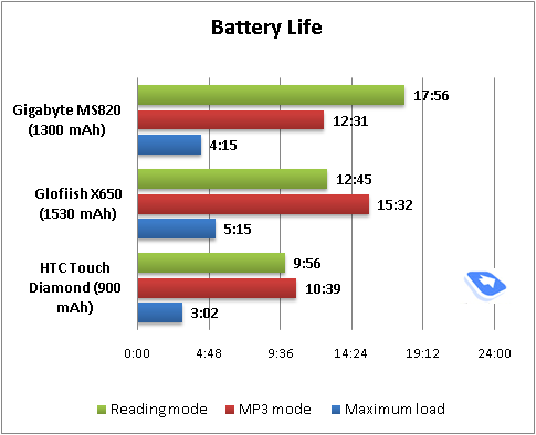В коммуникаторе используется Li-Ion аккумулятор емкостью 1300 мАч (емкость одинакова для MW720 и MS820). Для последних моделей от Gigabyte это типичная емкость. При использовании коммуникатора в стандартных условиях (до 30-40 минут разговоров в день, отправка 15-20 текстовых сообщений, проверка почты раз в час, использование Wi-Fi до часу в день) модель работает в среднем полтора дня. Неплохие показатели, учитывая функциональность устройства и, главное, VGA-дисплей.
