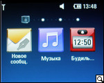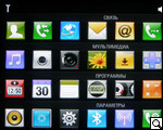 Иконки меню оформлены в четыре строки согласно четырем направлениям: "Связь", "Мультимедиа", "Программы", "Параметры". На экране одновременно отображается по четыре иконки в каждой строке, а для того, чтобы получить доступ к другим, необходимо перелистывать строчку по горизонтали. Какого-либо перелистывания по вертикали в данном случае не предусмотрено.