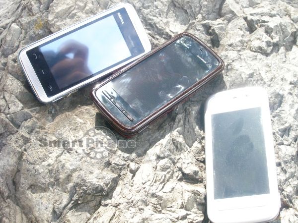 Окантовка лицевой панели во всех трех смартфонах достаточно чувствительна к воздействиям источников внешней среды. Особенно справедливо это в отношении Nokia 5230 Xpress Music и Nokia 5800 Xpress Music в пластиковой окантовке. Обод Nokia 5530 Xpress Music также оставляет на себе царапины и потертости, хотя в значительно меньшей мере, чем два предыдущих. Стоит отметить условия эксплуатации, в которых проверялись эти устройства – ежедневная, но вместе с тем аккуратная эксплуатация – устройства не ронялись, не терлись и т.д. Результат эксплуатации – вначале потертости появились на окантовке Nokia 5800 Xpress Music, затем Nokia 5230 Xpress Music и только потом Nokia 5530 Xpress Music. Минимальное количество потертостей Nokia 5530 Xpress Music объясняется, впрочем, наличием металлического ободка. Как объяснить тот факт, что окантовка Nokia 5800 Xpress Music потерлась больше, чем в Nokia 5230 Xpress Music, откровенно говоря, для меня непонятно.