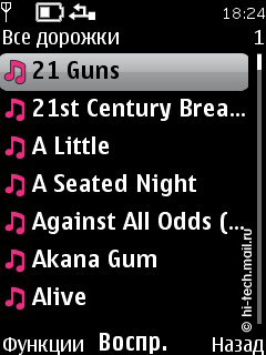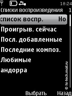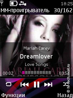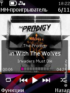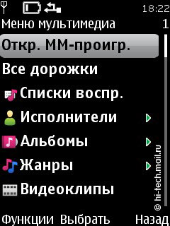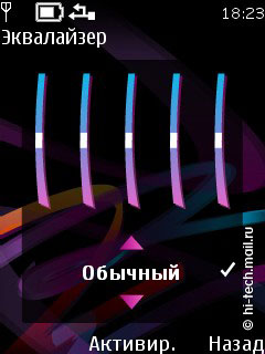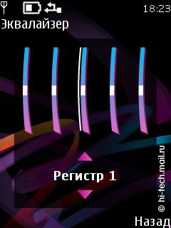 Поддерживаются следующие аудио форматы: AAC, AAC+, eAAC++, MP3, MP4, (SP)MIDI, (WB-)AMR, WMA, XMF. Эквалайзер 5-ти полосный, имеет две пользовательский настройки. Как и элементы интерфейса плеера, эквалайзер очень качественно прорисован, присутствует анимация. Есть режим расширенного стерео звучания, который находится в пункте меню Мультимедиа, но радикально его включение на качество звука не влияет. Доступны различные опции: деление по исполнителям, альбомам, жанрам и пр., повтор композиций и воспроизведение вразбивку. Управление осталось неизменным, переход к исполнителям, композициям осуществляется с помощью отклонений навигационной клавиши, все довольно просто и понятно.