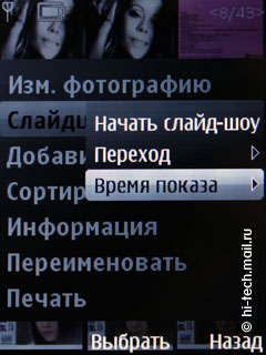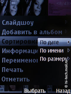 А вот галерею в Nokia 5330 Mobile TV изменили, она анимированная, картинки плавно увеличиваются при наведении и выборе. Есть 3 вида отображения содержимого папок (список, список с информацией, значки), можно настроить на свой вкус и цвет. Есть возможность слайд шоу содержимого определенной папки, что часто бывает полезно, если показывать кому-то много фотографий или видео роликов, однако для слайд-шоу отсутствуют какие-либо настройки, даже время показа кадров. Также есть сортировка материалов по имени, дате создания, формату и размеру. Есть полноэкранный режим просмотра, как фото, так и видео (в альбомной ориентации экрана, поддерживаются форматы H.263, H.264, MPEG-4 и 3GPP). Перемотка видеороликов прогрессивная, при полноэкранном просмотре строка проигрывания отображается внизу экрана, также выводятся иконки управления.