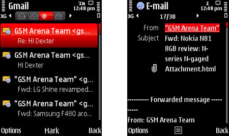 E-mail клиент чрезвычайно похож на те, что предлагались в других Symbian-телефонах. Если ваш аккаунт находится на одном из 1000 поддерживаемых популярных почтовых серверов, все необходимые настройки телефон возьмет оттуда, а вам останется лишь ввести адрес электронного ящика и пароль.