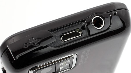На верхушке Samsung S8000 Jet находятся 3,5-миллиметровый аудиоразъем и порт microUSB с защитной заглушкой. В нижней части нет ничего, кроме микрофона.