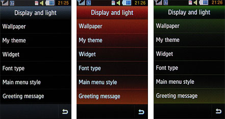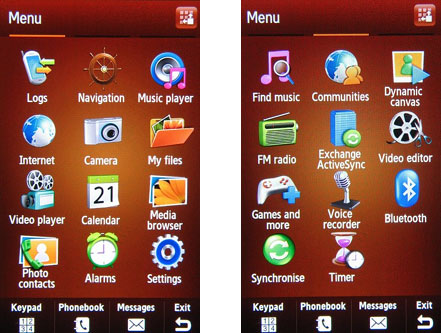 Главное меню простирается аж на три экрана, которые предполагается «прокручивать» по горизонтали. Такой даже чуть пугающий объем связан с тем, что иконки практически всех приложений, имеющихся в Samsung S8000 Jet, вынесены в главное меню.