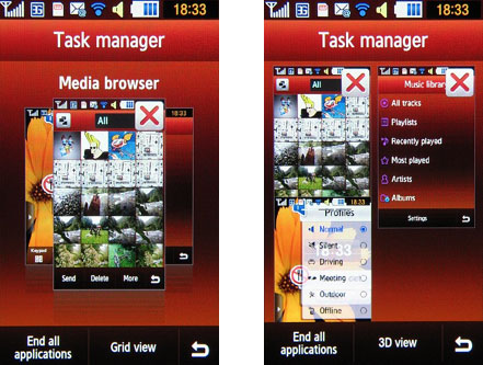 И в главном меню, и на экране ожидания внизу располагается панель с четырьмя кнопками: вызов клавиатуры, телефонная книга, сообщения и кнопка выхода/входа главного меню. Samsung S8000 Jet поддерживает многозадачность - попасть в диспетчер задач можно, удерживая кнопку «Меню». Можно выбрать «Закрыть все приложения», чтобы сэкономить время и не останавливать их по одному.