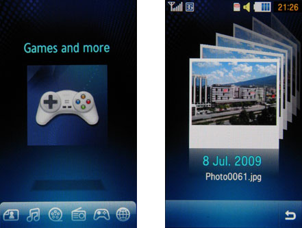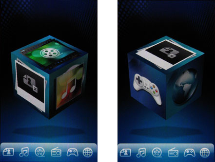 Каждой грани отведено свое индивидуальное назначение из раздела мультимедиа: фотоальбом, музыкальный проигрыватель, видеоплеер, FM-радио, игры и WEB-браузер. Можно куб прокручивать легкими прикосновениями к экрану, а можно воспользоваться рядом иконок, дублирующих значения его сторон. К примеру, вы нажимаете на значок видеоплеера, и кубик разворачивается к вам соответствующим боком. После выбора нужной грани на экране появится красочный «каталог» имеющихся файлов: музыка, картинки, игры и т.д. И уже здесь вы можете определиться с тем, что хотите послушать или посмотреть.