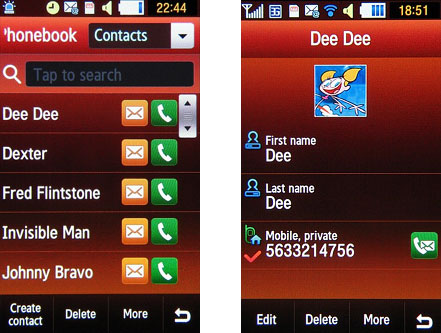 В телефонной книге Samsung S8000 Jet может храниться до 2000 контактов, каждому из них можно присвоить до 5 номеров, пометив один из них как основной. Остальные поля для заполнения пользователь назначает себе сам. Также каждому «обитателю» телефонной книги может быть индивидуально определено изображение, мелодия или видео и даже свой вариант вибрации. Что касается присвоенной картинки, она используется лишь для идентификации звонящего и не отображается в телефонной книге. В ней вообще ничего не отображается, кроме имен абонентов - остальная информация только при входе в профайл. Контакты можно разбивать на группы (не более 20 участников) и назначать уже им свои рингтоны и картинки.