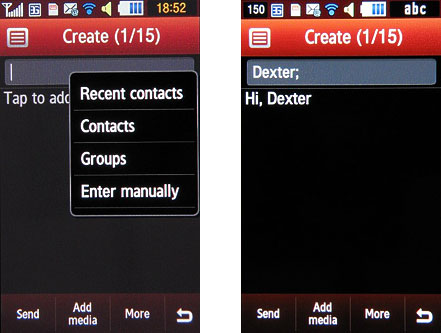 Редактор SMS-MMS позволяет отправлять сообщения группе контактов, вместо того, чтобы отправлять каждому индивидуально. При превышении максимального числа знаков (160) сообщения разбиваются на части - всего их может быть до 15. Количество частей указывается на экране.
