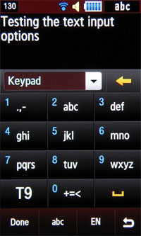 Ввод текста осуществляется с помощью клавиатуры, вид выбирает сам пользователь. Это может быть алфавитно-цифровая 3х4 или QWERTY - кому как удобнее. Режим предикативного ввода Т9 включается нажатием на одну виртуальную кнопку.