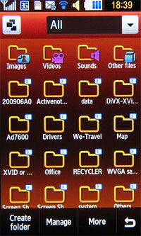 Samsung S8000 Jet оснащен одним из самых продуманных файловых менеджеров. Он может отображать отдельные файлы и папки из памяти телефона или с карты памяти, а также одновременно.