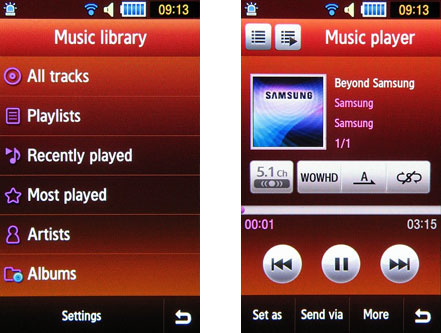 Samsung S8000 Jet укомплектован обновленным проигрывателем: новые обозначения при просмотре треков и новый способ отображения альбомных обложек в режиме воспроизведения.