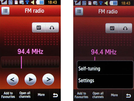Samsung S8000 Jet оснащен FM-приемником с поддержкой RDS. Интерфейс управления удобный, кнопки крупные - промазать сложно. Поиск станций происходит автоматически, все найденные сохраняются. Есть функция записи эфира.