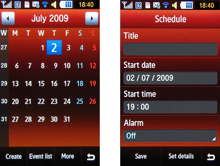 Samsung S8000 Jet поддерживает Quad-диапазон GSM с EDGE и 3G-технологию HSDPA 3.6 Мбит/с. Конечно же, есть модуль Bluetooth с поддержкой A2DP, работа с беспроводной гарнитурой не вызвала нареканий. Также телефон «ловит» сети Wi-Fi 802.11 b/g. Несказанно радует наличие стандартного, а не фирменного, как раньше, разъема microUSB. При подключении к компьютеру можно выбрать режим, в котором Samsung S8000 Jet будет с ним взаимодействовать: Mass Storage, Media, Samsung PC Studio. Mass Storage предоставляет доступ к карте памяти, при таком соединении использовать телефон для звонков нельзя. Органайзер.Samsung S8000 Jet преисполнен самых разных приложений. Во-первых, календарь. Он может принимать три различных вида: помесячно, понедельно или за один день. Можно выбрать с какого дня будет начинаться ваша неделя – оптимистично с воскресенья или обыденно с понедельника. А вот события в календаре можно создавать только двух видов: встреча и годовщина.