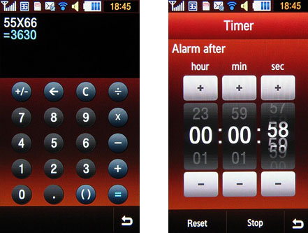 Далее, по значимости, конечно же, идет будильник. Можно создать до 10 штук - для каждого задать мелодию, громкость, количество повторов и заголовок. Калькулятор в Samsung S8000 Jet удобный с крупными кнопками, на которые удобно попадать пальцем. Среди прочих функций: диктофон (до 60 минут), мировое время, конвертер единиц, таймер и секундомер. Также есть возможность создавать списки дел и заметки.