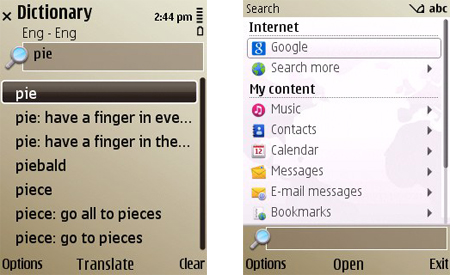 Утилита Search, или же «Поиск», поддерживает поиск по всему контенту мобильного телефона, от записи в телефонной книге до почтовых сообщений и содержимого карты памяти. Наконец, Nokia E52 оснащен словарем с богатой базой, дополнительные языковые базы к нему можно скачать с сайта Nokia.
