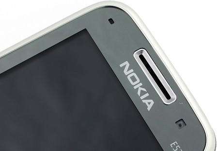 Динамик Nokia E52 обрамлен тонкой серебристой окантовкой, рядом с ним - датчик освещенности и камера для видеозвонков.