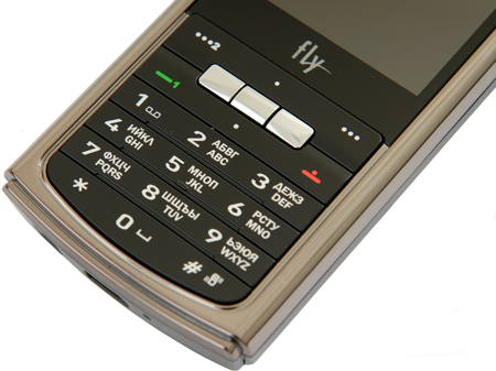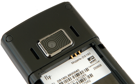 Очень оригинально скомпонован навигационный блок. Мы привыкли, что навигационная клавиша - круглая или же квадратная, но Fly DS 180 предлагает свой вариант. Посередине навигационного блока находятся три клавиши под металл, выше и ниже них - две полоски пластмассы с небольшими белыми точками. Не сразу и догадаешься, что это не просто декоративные элементы, а полноценные кнопки. Фактически получается, что вместо одной навигационной клавиши - 5 отдельных кнопок. Кстати, мы бы не отказались, чтобы такой дизайнерский ход скопировали и другие компании - и эффектно, и, как выяснилось, удобно. По краям навигационного блока разместились четыре софт-клавиши: приема и отбоя звонка, вызова меню и телефонной книги. Все кнопки, заменяющие навигационную клавишу, можно запрограммировать по своему усмотрению, хотя и настройки по умолчанию очень практичны - например, активация плеера, фотокамеры, Bluetooth.