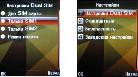 В пункте меню «Настройки» ничего особо интересного нет, кроме настроек Dual-SIM. Можно отдельно включить одну из SIM-карт, активировать их обе или же перевести телефон в режим полета и отключить обе карты. Кстати, важный момент. Телефон оснащен только одним радиомодулем, поэтому если вы разговариваете по одному номеру, второй в это время будет «вне зоны доступа». Естественно, в режиме ожидания доступны оба номера.