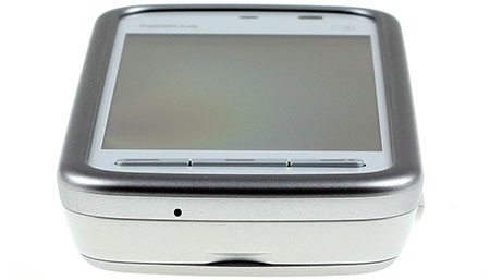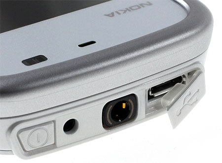 Верхний торец Nokia 5230 изобилует всяческими элементами. Тут вам и порт MicroUSB под заглушкой, и разъем для зарядного устройства, и стандартный 3,5 миллиметровый аудиоджек, и кнопка включения.