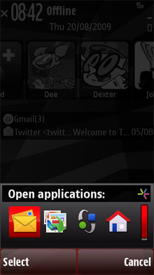 При необходимости в Nokia 5230 можно вызвать Диспетчер задач. Делается это путем нажатия и удержания кнопки меню (средняя, под экраном). Как и раньше, он «всплывает» поверх всех окон в нижней части экрана. Поскольку кнопка «С» не предусмотрена, управление приложениями осуществляется следующим образом: вы нажимаете на нужную иконку, а затем выбираете одно из предложенных телефоном действий: открыть или закрыть.