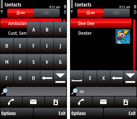 Облегчению поиска способствует и умная динамическая клавиатура, которая показывает только те буквы, которые соответствуют фактическому наличию контактов. После ввода первой буквы имени их число уменьшается, и остаются только те, которые действительно присутствуют в именах контактов. На самом деле, очень удобный инструмент.