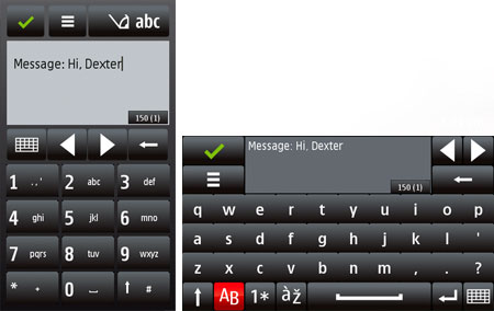 Здесь стоит также упомянуть о такой немаловажной для удобства пользования редактором сообщений вещи, как клавиатура. В вертикальном положении телефон предлагает использовать стандартную «телефонную» (алфавитно-цифровую) клавиатуру. При повороте в пейзажное состояние, клавиатура автоматически меняется на QWERTY.