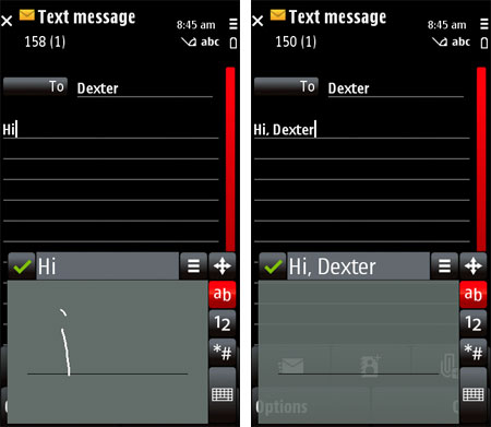 Наконец, особо пытливым предлагается в Nokia 5230 использовать функцию побуквенного распознавания рукописного текста. Однако писать каллиграфическим почерком не требуется, телефон готов учиться и довольно скоро «запоминает» руку хозяина и адекватно распознает все буквы. Так после трех дней общения с телефоном нам удалось написать от руки не просто короткое SMS, а целое письмо, пусть и небольшое. Однако нажимать кнопки виртуальной клавиатуры все же проще и быстрее.