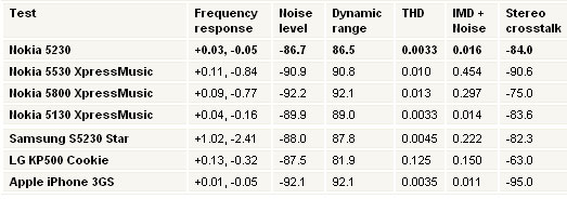 Качество звука - в лучших традициях Nokia. Все последние новинки финской компании звучат отлично, но Nokia 5230 смогла превзойти своих собратьев. Смотрим табличку в подтверждение: