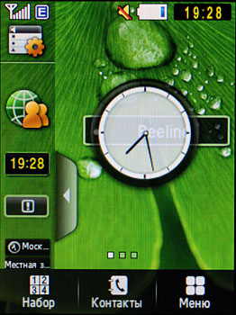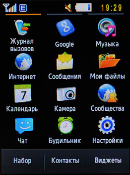 Интерфейсом и меню Samsung C3510 похож как брат-близнец на первый Samsung Corby . Нижняя панель домашнего экрана традиционно состоит из кнопок доступа к меню, набору номера и списку контактов. Слева, под стрелкой, прячется линейка виджетов, которые, при желании, можно расположить на экране. Предустановленных виджетов не слишком много. Половина из них - это ссылки на всевозможные Интернет-ресурсы (погодные, новостные порталы, а также социальные сети), половина - доступ к управлению телефоном и напоминания. Сразу хочу предупредить увлекающихся любителей виджетов - весь список целиком на экранах не разместить, диагональ не позволяет.