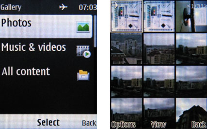 Фотогалерея Nokia 6303i Classic организована хорошо, всё предельно просто и понятно. Фотографии собраны в папки, которые можно просмотреть списком, иконками и иконками с подписями. Фотографии (а так же любые изображения и видео) можно смотреть в вертикальном и горизонтальном режиме, посредством анимированного слайдшоу (не слишком быстрого) или простого пролистывания. Картинки можно переносить в альбомы по одному или группами, сортировать по дате.