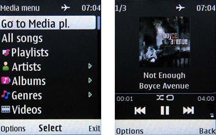 Композиции могут проигрываться по очереди, в случайном порядке, повторяться. Музыкальную библиотеку можно сортировать по исполнителям, альбомам, жанрам, композиторам или не сортировать вовсе. При создании собственных плейлистов также можно воспользоваться предустановленным делением на избранные, часто проигрываемые, последние, добавленные и мои композиции. Очень удобная функция, позволяющая экономить массу времени. Список поддерживаемых плеером форматов достаточно широк (MP3, WMA, WAV, NB AMR, WB AMR, MIDI, AAC, eAAC+, eAAC+). Эти же файлы можно установить на звонки.