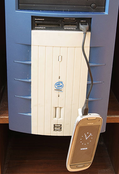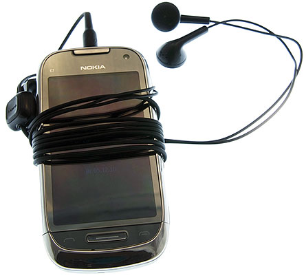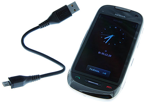 Такие результаты работы батареи, конечно же, вряд ли будут получены кем-либо в реальной жизни, в условиях, не приближенных к лабораторным. На самом деле, после тестирования, можно сказать, что реалии таковы: время работы Nokia C7 составляет полтора–два дня. При этом вам удастся посмотреть на смартфоне средней продолжительности фильм, провести в Интернете около 30 минут, сделать десяток другой фотографий и несколько непродолжительных звонков, после чего вам будет вновь необходимо подзарядить свой смартфон. Конечно, плюсом является то, что время полной зарядки аккумулятора невелико и составляет порядка полутора часов. Кроме того, смартфон можно заряжать через USB-соединение. Хотя по поводу USB- зарядки и USB соединения вообще у меня есть замечание относительно длины шнура идущего в комплекте. Посмотрите на фотографии.