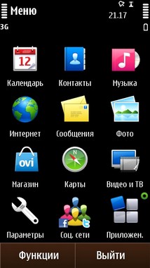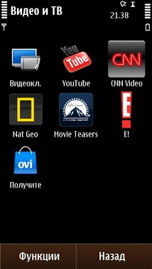 Раздел «Видео и ТВ» выделен отдельной иконкой на экране меню. В этом разделе вы не только получаете доступ к своим видеофайлам закаченным на смартфон, но и у вас также есть возможность воспользоваться прямыми ссылками на популярные видеоресурсы в сети интернет, а также зайти в OVI приложения для доступа к интернет телевидению. Опят таки, мы рассмотрим работу этих приложений и их функциональность в разделе посвященном мультимедиа.