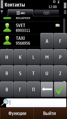 Меню контактов дает доступ к контактам в записной книжке. При этом поиск необходимого человека можно осуществлять как с помощью боковой полосы прокрутки, так и с помощью поискового поля находящегося внизу экрана. Всё организовано логично и просто.
