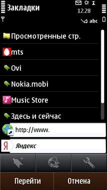 Следующая вкладка - это меню «Интернет», через которое вы сможете войти во Всемирную паутину. При этом у вас есть возможность посетить ранее просмотренные страницы, создать свои собственные закладки или посетить основные центры и магазины Nokia, которые могут быть вам полезны при использовании смартфона.