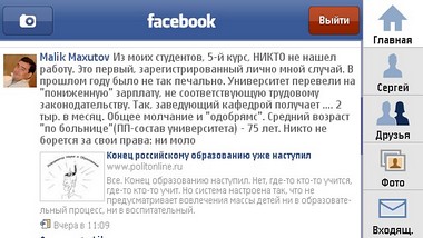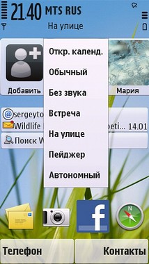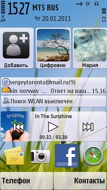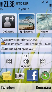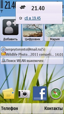 Чуть ниже размещены иконки избранных контактов, информация о полученных электронных письмах и панель доступа и информации по WLAN-соединениям.