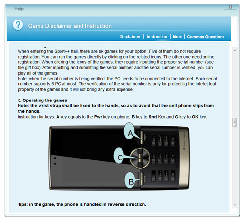 Игровой процесс можно описать фразой «улыбаемся и машем». Причем во всех представленных играх. В боулинге надо катить шары, в бадминтоне отбивать воланчик и т. д. Кроме взмахов телефоном, надо активно использовать клавиши включения телефона, вызова и OK. Поэтому телефон надо держать вверх тормашками. Признаюсь, на меня (начинавшего знакомство с ПК с первых «Героев») игрушки особого впечатления не произвели. Хотя, для детей это будет, наверное, интересно. А вот мультиплеер (предусмотрен режим для двух игроков) протестировать не удалось (из-за отсутствия второго телефона).