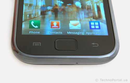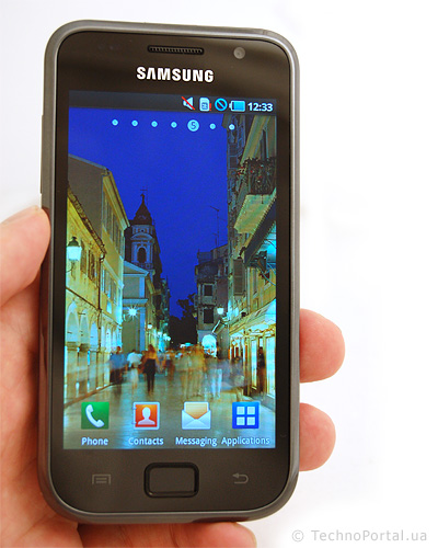 Об iPhone мы вспомнили неслучайно. Из всех сенсорных телефонов, с которыми нам доводилось сталкиваться, пожалуй, именно Galaxy S наиболее близок к этому аппарату с точки зрения внешнего восприятия. Но было бы несправедливым, сказать, что Samsung не привнес в эти привычные формы что-то свое. Например, выступающая рамка со скосом. Она немного возвышается над поверхностью экрана. Это не защитит всю переднюю панель от царапин (слишком уж она большая), но эффект все-таки есть. Кстати, в пластиковом корпусе есть свои преимущества: нет экранирующих металлических поверхностей, которые препятствовали бы свободному прохождению сигнала. То есть, проблема iPhone 4 с приемом этому телефону не грозит.