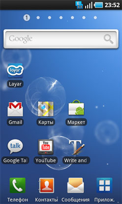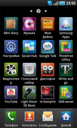 В Samsung Galaxy S пользователь увидит привычный интерфейс Touch Wiz 3, который производитель сделал кросс-платформенным, то есть не зависящим от того, на какой операционной системе работает аппарат — Android или Bada. Это важное преимущество для пользователя, которому не приходится ничего осваивать с нуля при смене телефона. Сменив, скажем Wave на Galaxy S, вы увидите привычные виджеты и аналогичный принцип организации нескольких рабочих столов. Всего таких рабочих столов может быть до семи, а их порядок можно менять на свое усмотрение или при необходимости вовсе удалить.